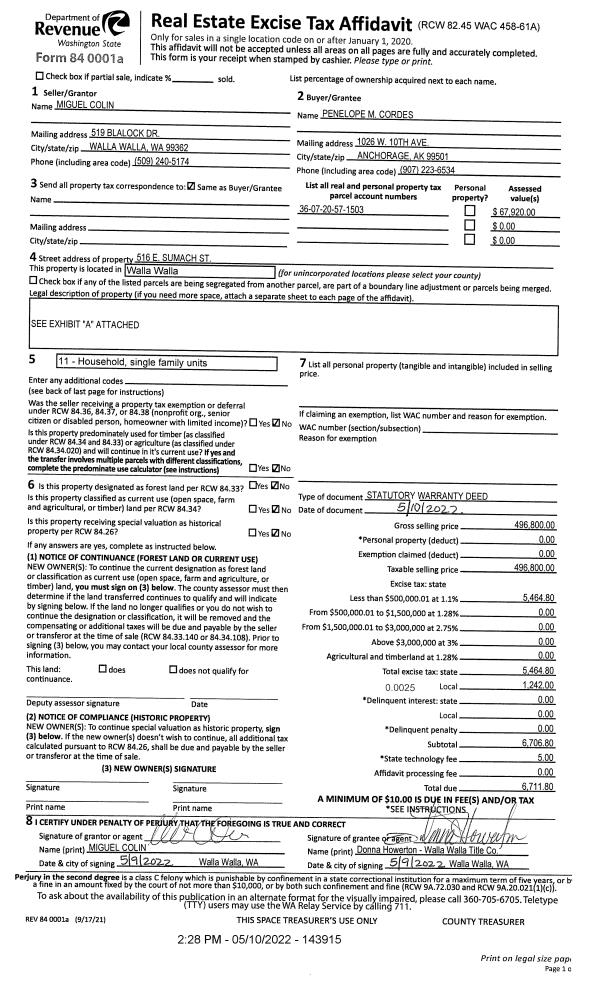 | 2 | 05/10/2022 | SWD | STATUTORY WARRANTY DEED | COLIN MIGUEL | CORDES PENELOPE M | | | $496,800.00 | 143915 | 2022-03980 |