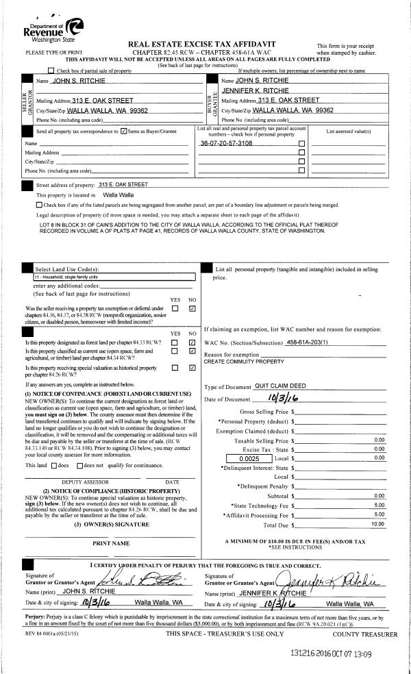 | 2 | 10/03/2016 | QCD | QUIT CLAIM DEED | RITCHIE JOHN S | RITCHIE JOHN S & JENNIFER K | | | | 131216 | 2016-08289 |