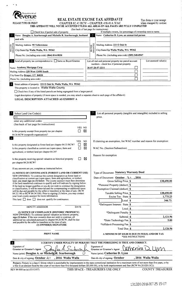 | 1 | 10/25/2016 | SWD | STATUTORY WARRANTY DEED | SCARBOROUGH DOUGLAS A & MICHELLE R | LYON CATHERINE D | | | $138,690.00 | 131320 | 2016-08859 |