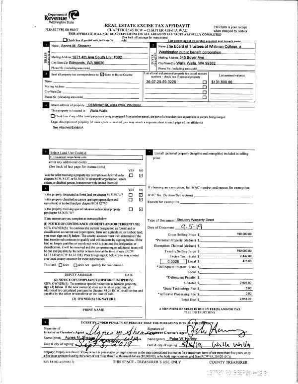 | 1 | 09/20/2019 | SWD | STATUTORY WARRANTY DEED | SHEARER AGNES M | WHITMAN COLL BOARD OF TRUSTEES | | | $190,000.00 | 137727 | 2019-07409 |