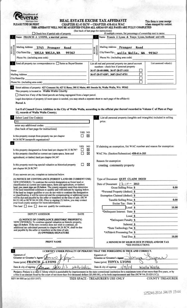 | 2 | 04/11/2019 | QCD | QUIT CLAIM DEED | LYONS MICHAEL A AND FRANCIS J & TONYA | LYONS MICHAEL A ET AL | | | $0.00 | 136787 | 2019-02798 |