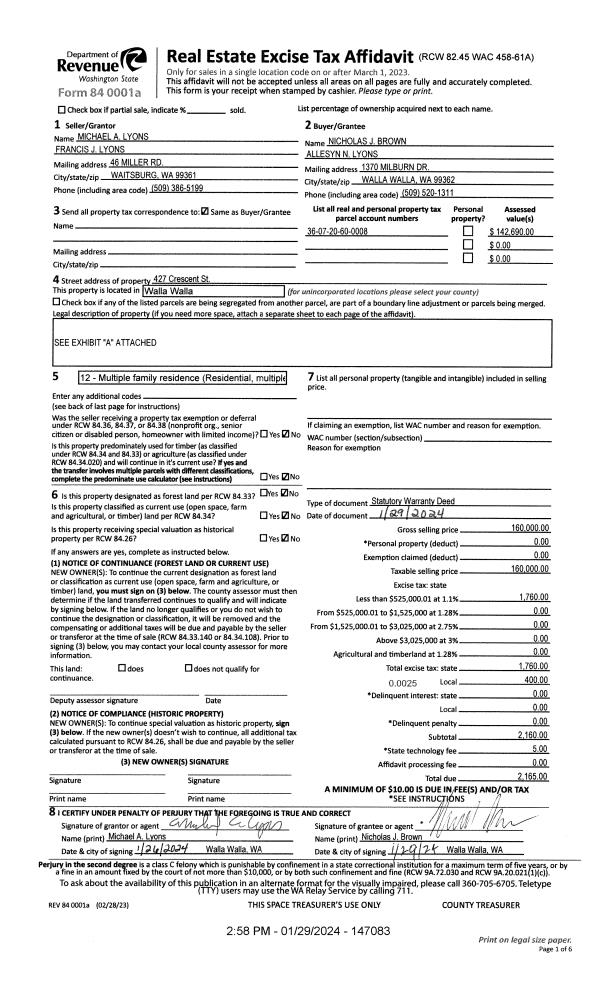 | 1 | 01/29/2024 | SWD | STATUTORY WARRANTY DEED | LYONS MICHAEL A ET AL | BROWN NICHOLAS J | | | $160,000.00 | 147083 | 2024-00469 |