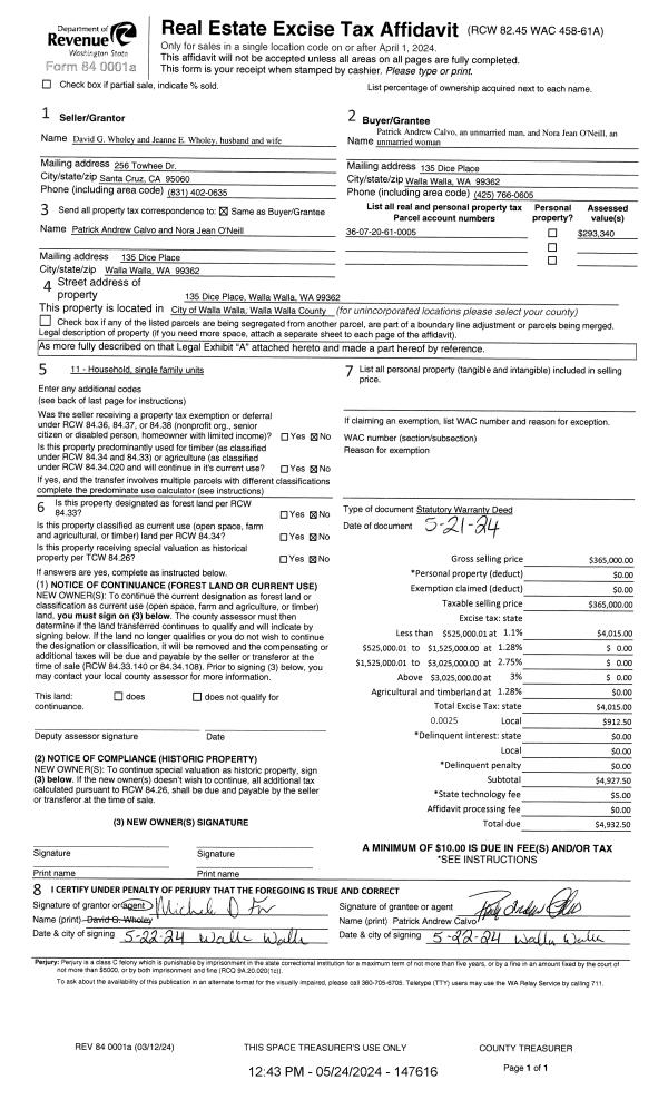| 1 | 05/24/2024 | SWD | STATUTORY WARRANTY DEED | WHOLEY DAVID G & JEANNIE E | CALVO PATRICK ANDREW | | | $365,000.00 | 147616 | 2024-02781 |