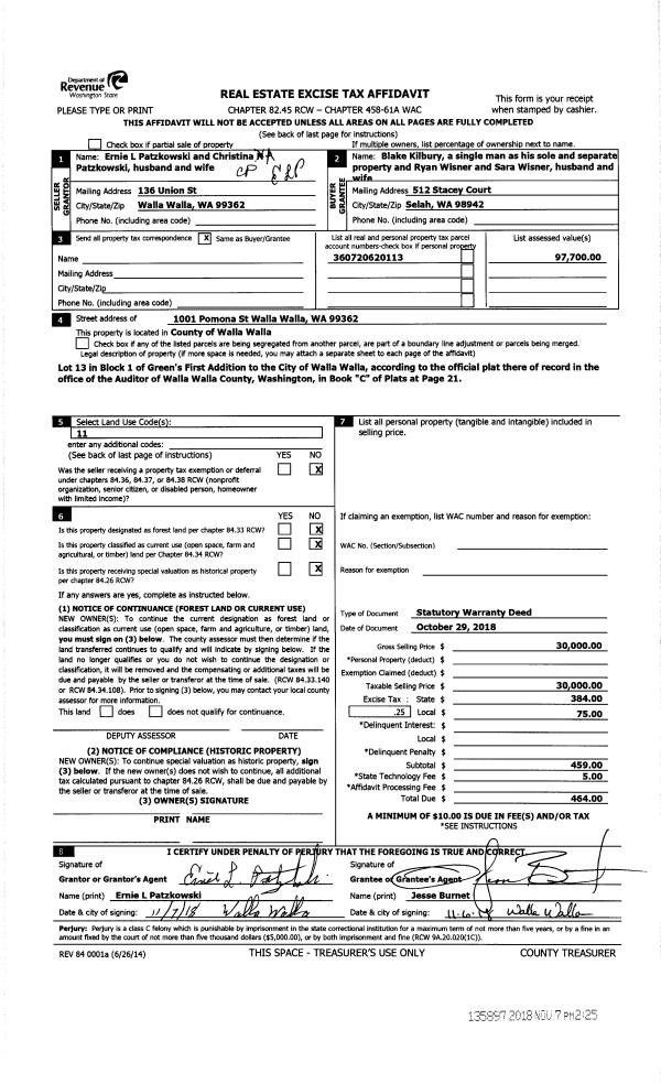 | 2 | 11/07/2018 | SWD | STATUTORY WARRANTY DEED | PATZKOWSKI ERNIE L | KILBURY BLAKE | | | $30,000.00 | 135897 | 2018-09257 |