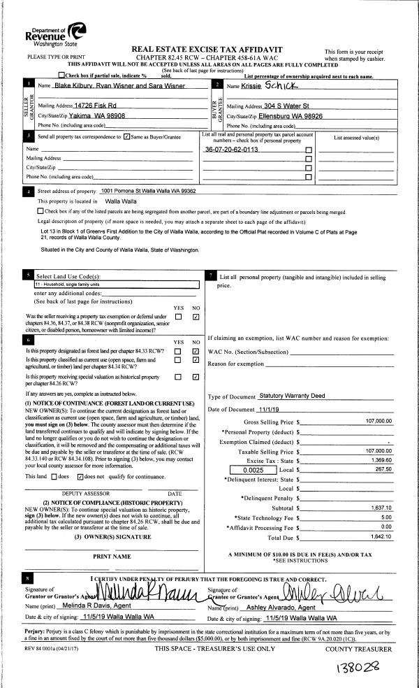 | 1 | 11/05/2019 | SWD | STATUTORY WARRANTY DEED | KILBURY BLAKE | SCHICK KRISSIE | | | $107,000.00 | 138028 | 2019-09080 |