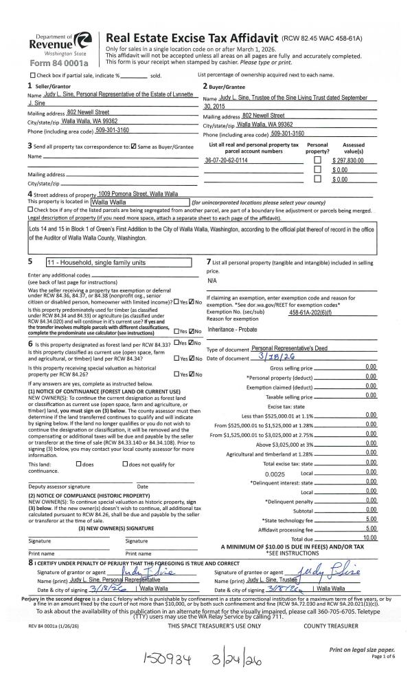 | 1 | 05/02/2018 | SWP | Special Warranty Deed | SINE MARK G & LOIS L TRUST | SINE LYNNETTE J | | | $0.00 | 134646 | 2018-03535 |
