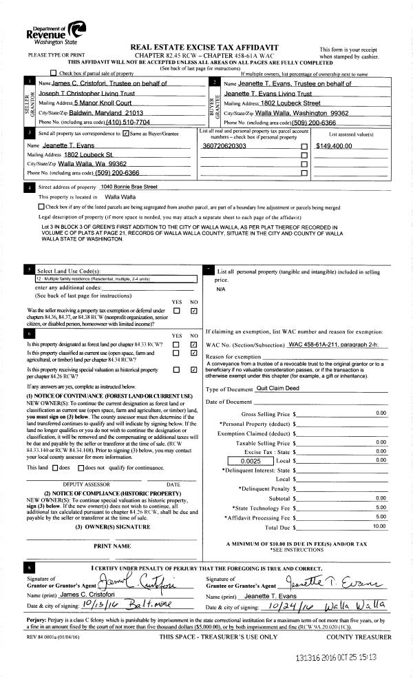 | 2 | 10/24/2016 | QCD | QUIT CLAIM DEED | CHRISTOPHER JOSEPH T TRUST | EVANS JEANETTE T LIVING TRUST | | | $0.00 | 131316 | 2016-08853 |