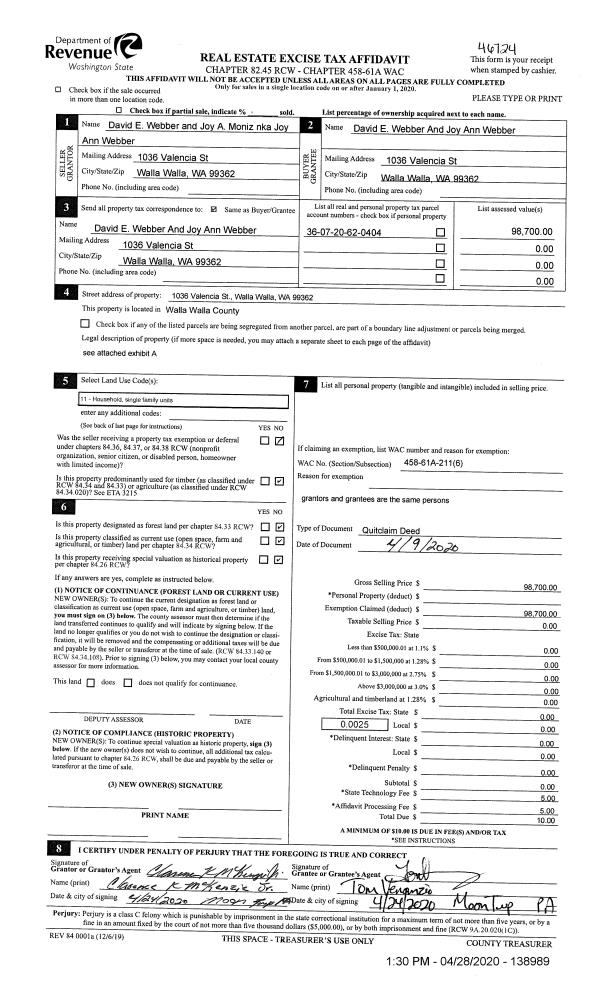 | 1 | 04/09/2020 | QCD | QUIT CLAIM DEED | WEBBER DAVID E | WEBBER DAVID E & JOY ANN | | | $0.00 | 138989 | 2020-03633 |