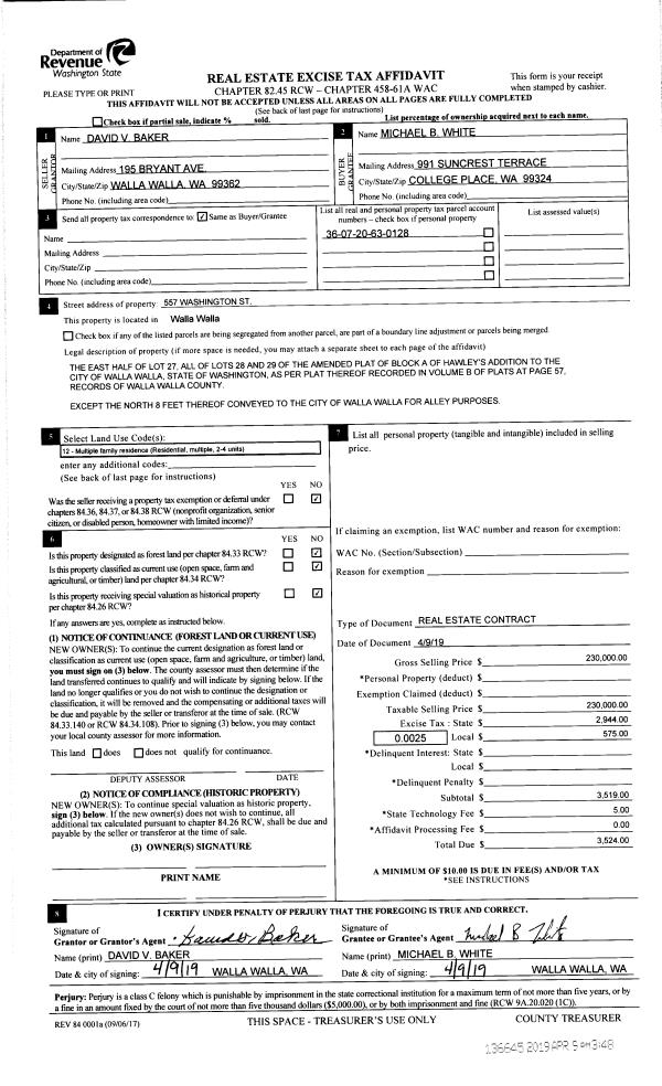 | 3 | 04/09/2019 | REAL ESTAT | REAL ESTATE CONTRACT | BAKER DAVID V | WHITE MICHAEL BRENT | | | $230,000.00 | 136645 | 2019-02227 |