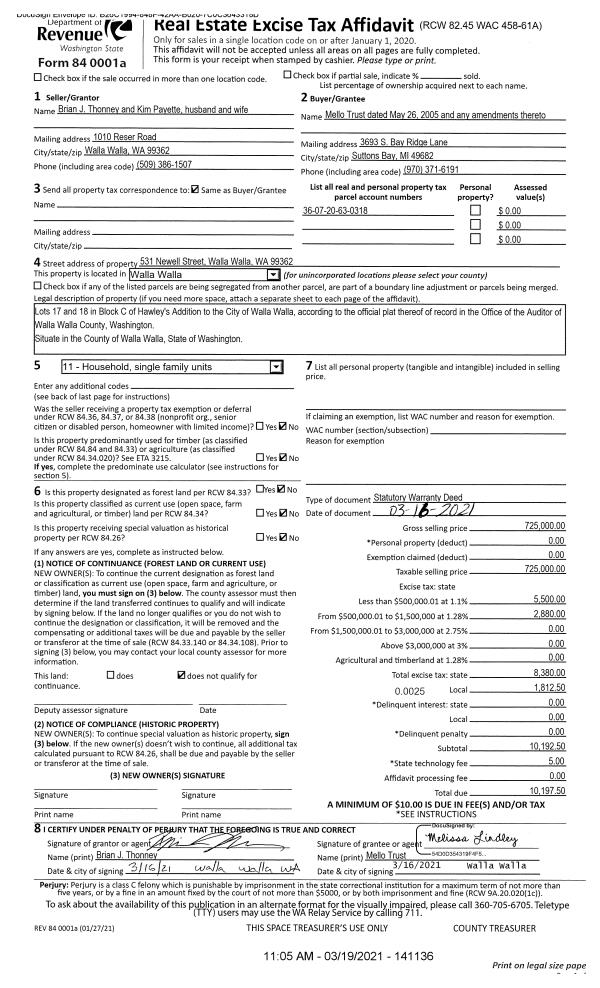 | 2 | 03/19/2021 | SWD | STATUTORY WARRANTY DEED | THONNEY BRIAN J | MELLO TRUST | | | $725,000.00 | 141136 | 2021-03156 |