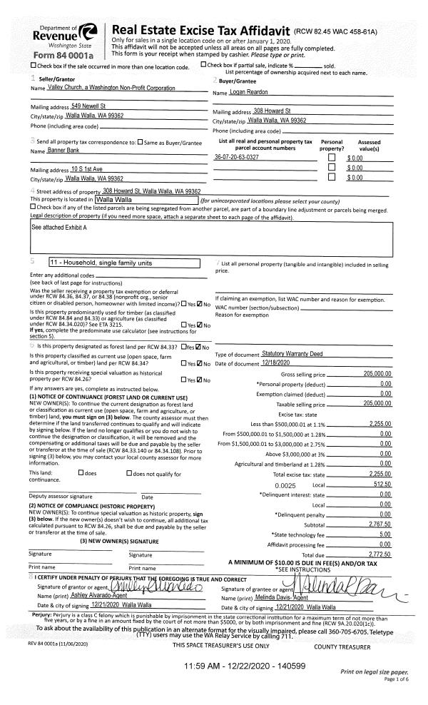| 1 | 12/22/2020 | SWD | STATUTORY WARRANTY DEED | VALLEY CHURCH | REARDON LOGAN | | | $205,000.00 | 140599 | 2020-13620 |