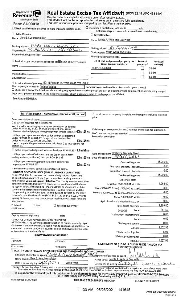 | 1 | 05/26/2021 | SWD | STATUTORY WARRANTY DEED | KUECHENMEISTER MARK E | WILLIS MONTE A & SUE C | | | $115,000.00 | 141645 | 2021-06381 |