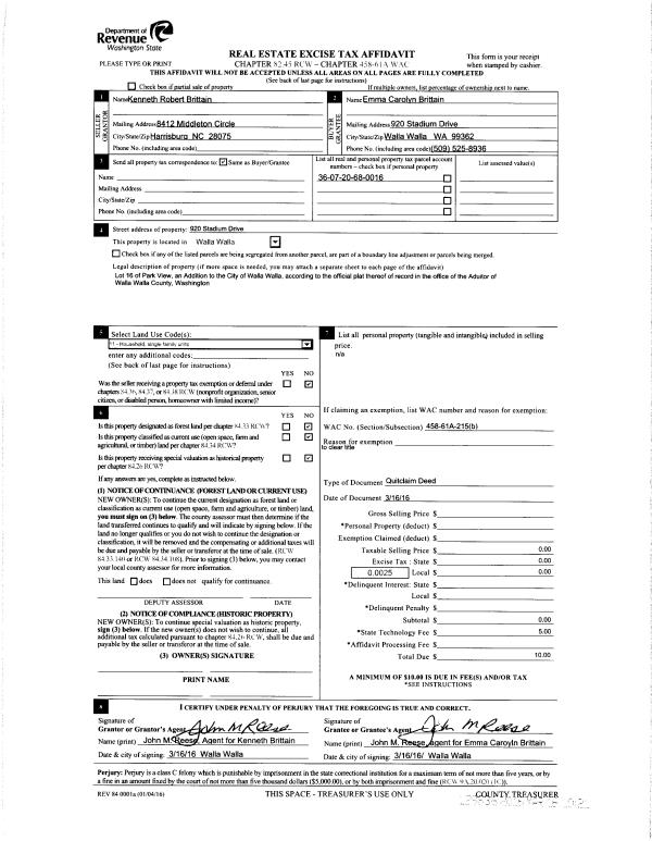 | 3 | 03/16/2016 | QCD | QUIT CLAIM DEED | BRITTAIN KENNETH ROBERT | BRITTAIN EMMA CAROLYN | | | $0.00 | 129836 | 2016-01966 |