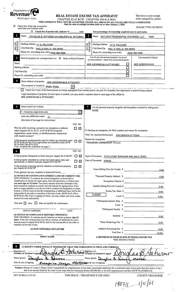 | 1 | 06/26/2020 | BARGAIN & | BARGAIN & SALE DEED | SATURNO DOUGLAS B & MALINDA M | SATURNO RESIDENTIAL HOLDINGS LLC | | | $0.00 | 140711 | 2021-00722 |