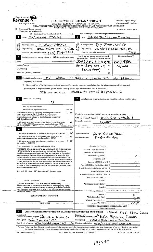 | 1 | 04/06/2022 | QCD | QUIT CLAIM DEED | CUEVAS FILLOMENA | CUEVAS BELEN FILOMENA | | | $0.00 | 143779 | 2022-03210 |