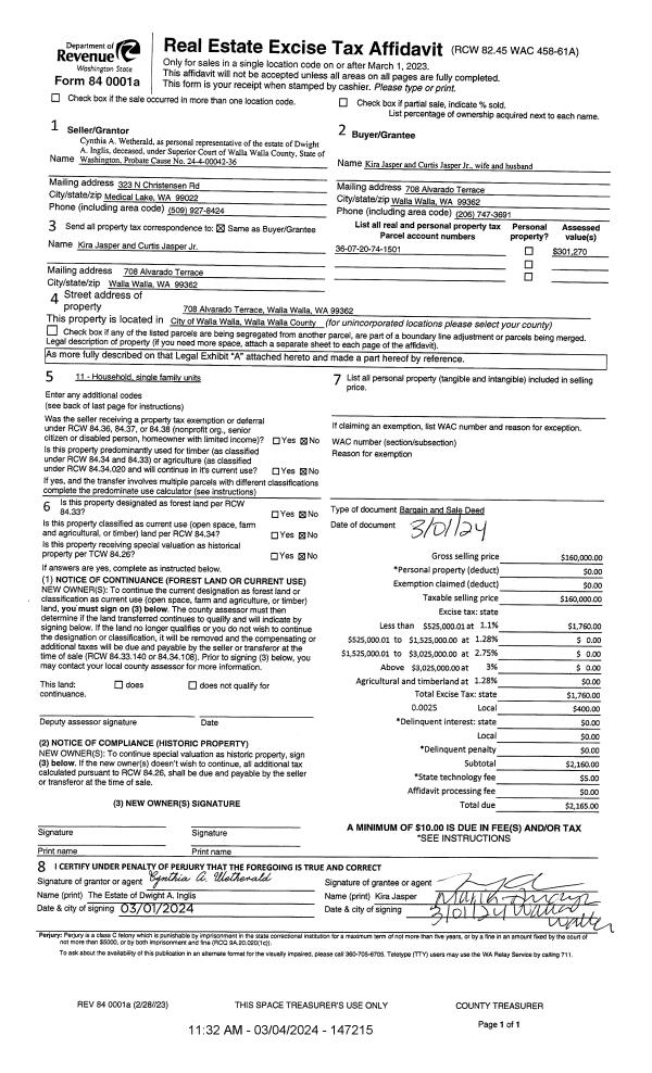 | 1 | 03/04/2024 | BARGAIN & | BARGAIN & SALE DEED | INGLIS DWIGHT A ESTATE OF | JASPER KIRA & CURTIS JR | | | $160,000.00 | 147215 | 2024-01071 |