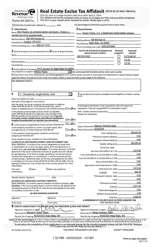 | 1 | 04/30/2024 | SWD | STATUTORY WARRANTY DEED | RUBENS BIRCH & DAVID L | HOUSE 2 HOME LLC | | | $265,000.00 | 147481 | 2024-02221 |