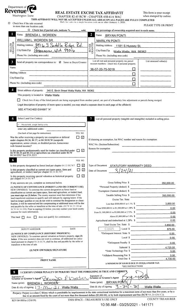 | 4 | 03/25/2021 | SWD | STATUTORY WARRANTY DEED | WORDEN WILLIAM SR & BRENDA | PONTI BRYAN | | | $350,000.00 | 141171 | 2021-03398 |