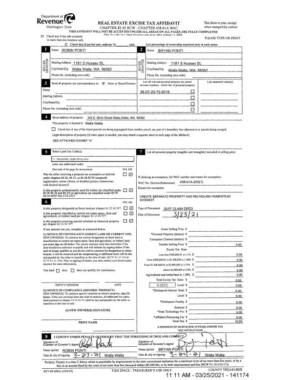 | 3 | 03/23/2021 | QCD | QUIT CLAIM DEED | PONTI ROBIN | PONTI BRYAN | | | | 141174 | 2021-03400 |