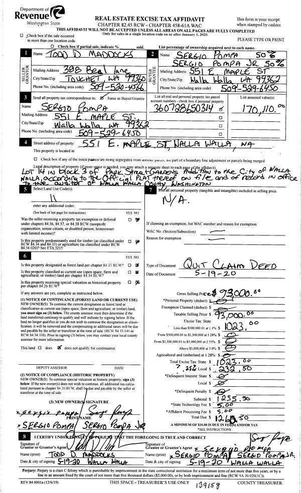 | 2 | 05/26/2020 | QCD | QUIT CLAIM DEED | MADDOCKS TODD D | POMPA SERGIO | | | $93,000.00 | 139158 | 2020-04552 |