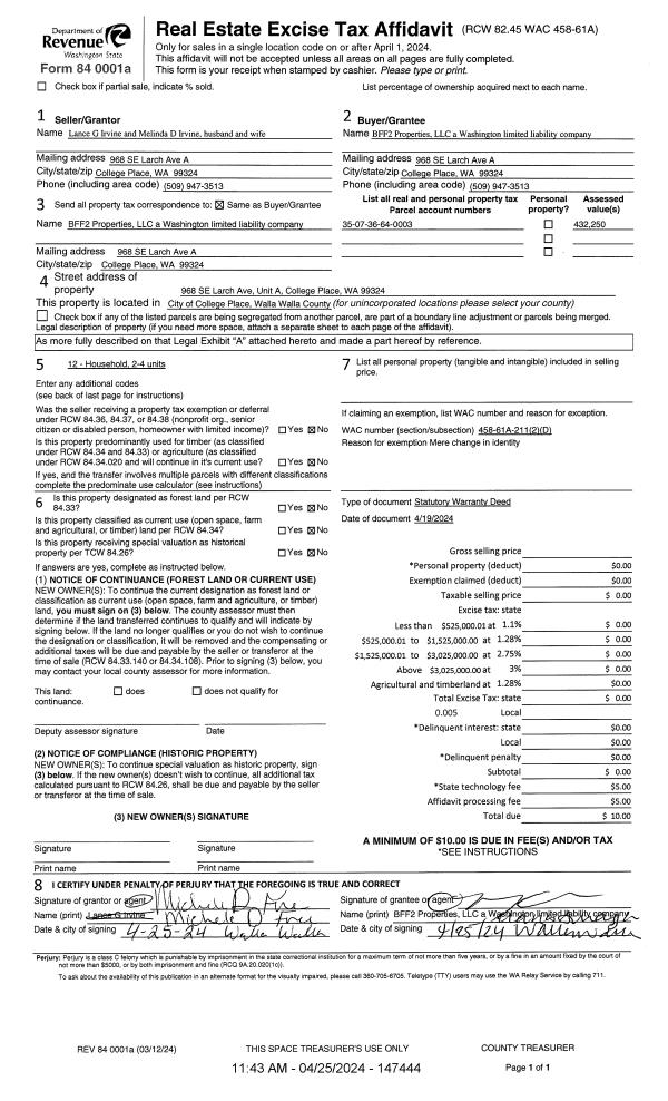 | 1 | 04/25/2024 | WARRANTY D | WARRANTY DEED | IRVINE LANCE & MELINDA | BFF2 PROPERTIES LLC | | | | 147444 | 2024-02086 |