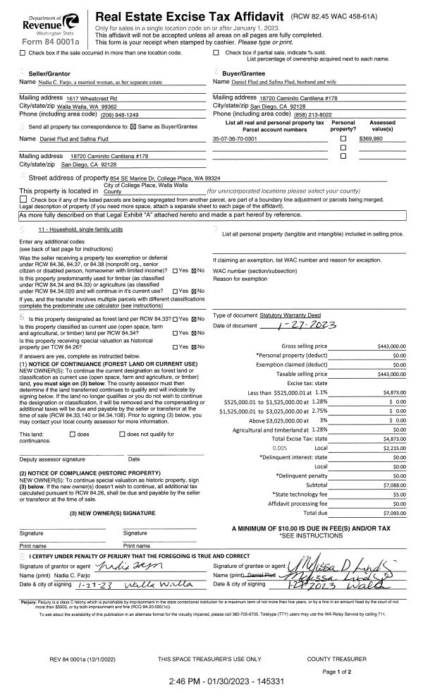 | 1 | 01/30/2023 | SWD | STATUTORY WARRANTY DEED | FARJO NADIA C | FLUD DANIEL & SAFINA | | | $443,000.00 | 145331 | 2023-00464 |
