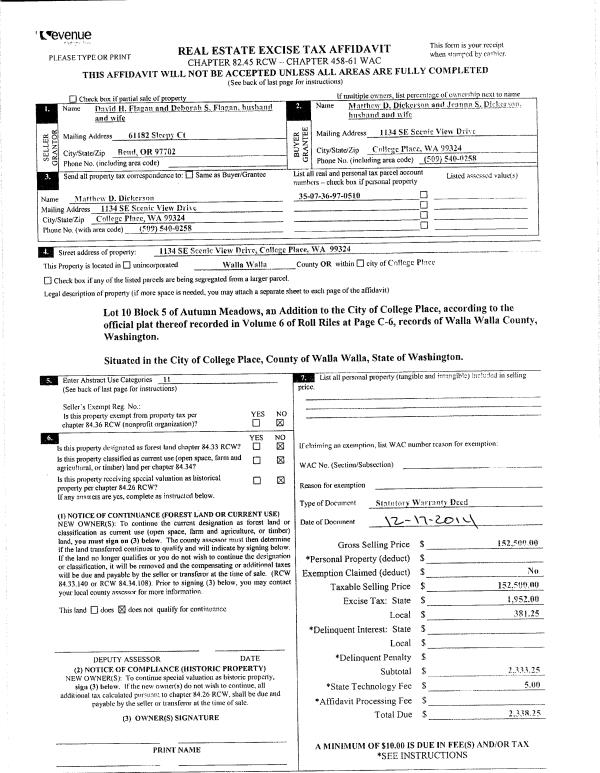 | 1 | 12/23/2014 | SWD | STATUTORY WARRANTY DEED | FLAGAN DAVID H & DEBORAH S | DICKERSON MATTHEW D & JEANNA S | | | $152,500.00 | 127175 | 2014-09365 |