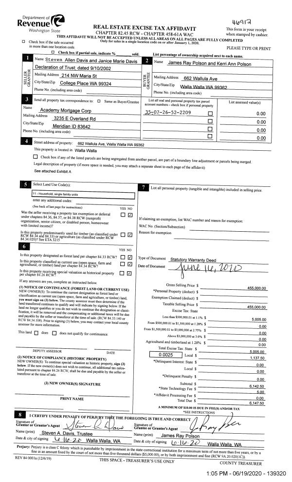 | 1 | 06/19/2020 | SWD | STATUTORY WARRANTY DEED | STEVEN ALLEN DAVIS & JANICE MARIE DAVIS DECLARATION OF TRUST | POLSON JAMES RAY & KERRI ANN | | | $455,000.00 | 139320 | 2020-05657 |
