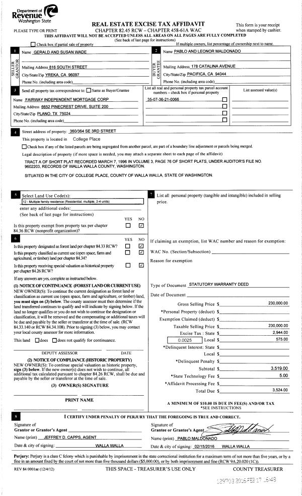 | 1 | 02/17/2016 | SWD | STATUTORY WARRANTY DEED | WADE GERALD H & SUSAN M | MALDONADO PABLO & LEONOR ISABEL | | | $230,000.00 | 129703 | 2016-01205 |