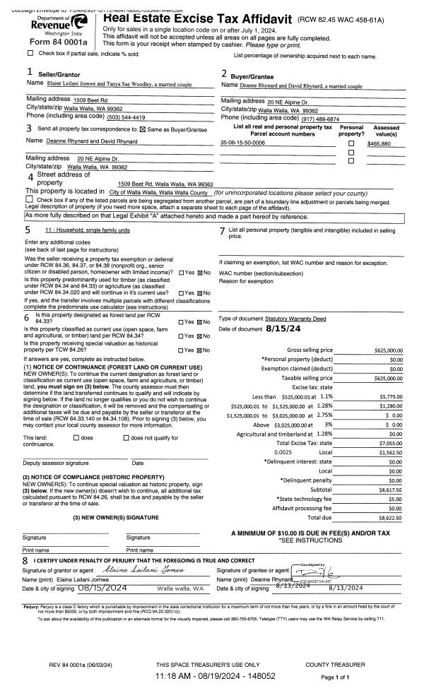 | 1 | 08/19/2024 | SWD | STATUTORY WARRANTY DEED | JOMWE ELAINE LEILANI | RHYNARD DAVID & DEANNE | | | $625,000.00 | 148052 | 2024-04609 |