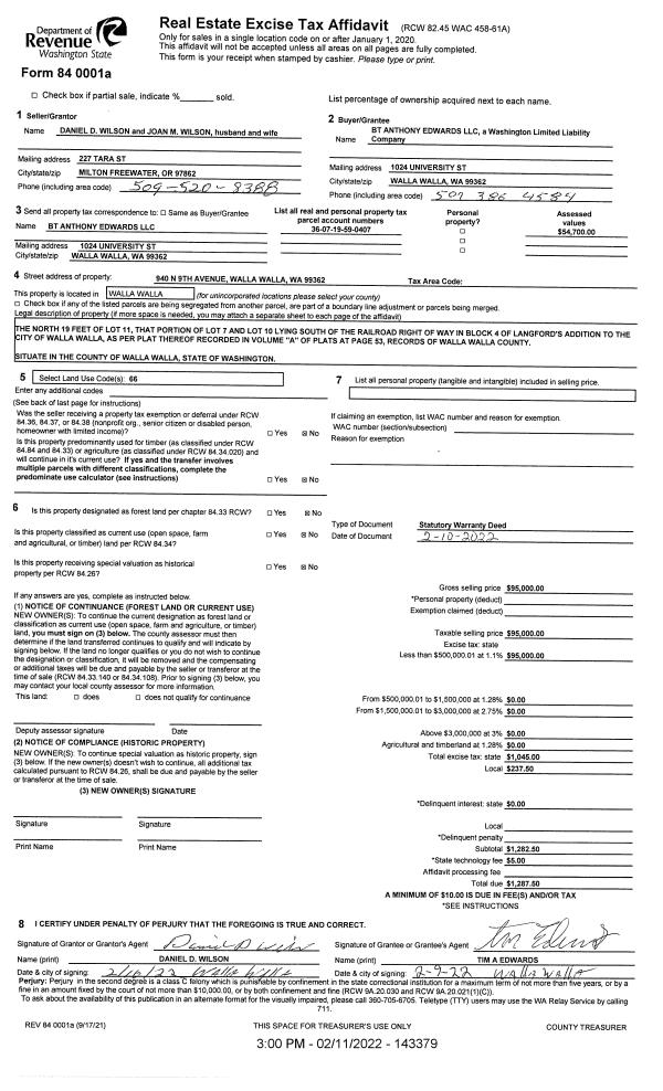 | 2 | 02/11/2022 | SWD | STATUTORY WARRANTY DEED | WILSON DANIEL D & JOAN M | BT ANTHONY EDWARDS LLC | | | $95,000.00 | 143379 | 2022-01300 |