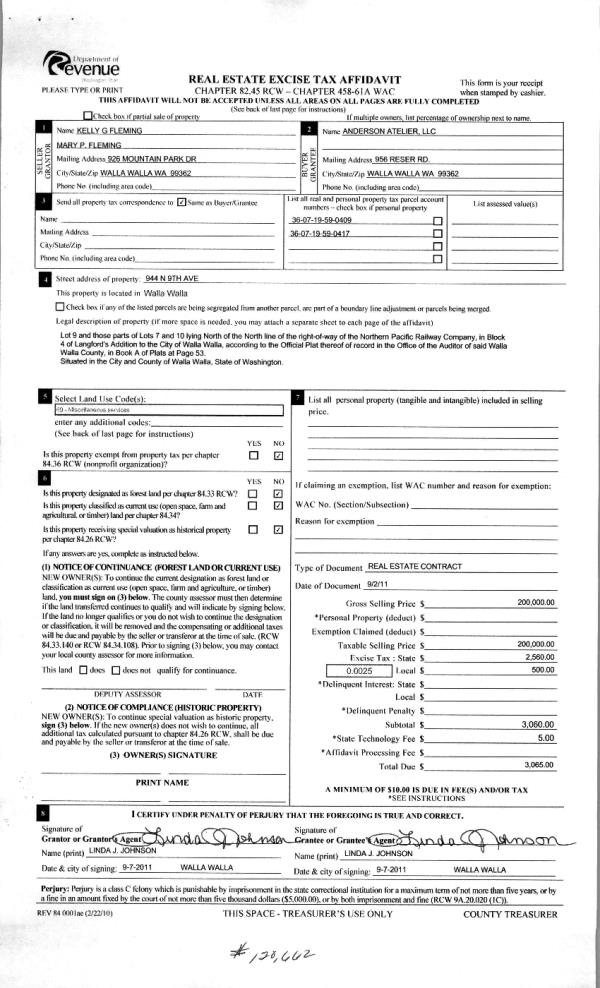 | 2 | 09/07/2011 | WARRANTY D | WARRANTY DEED | FLEMING KELLY G & MARY P | ANDERSON ATELIER LLC | | | $200,000.00 | 120662 | 2011-07011 |