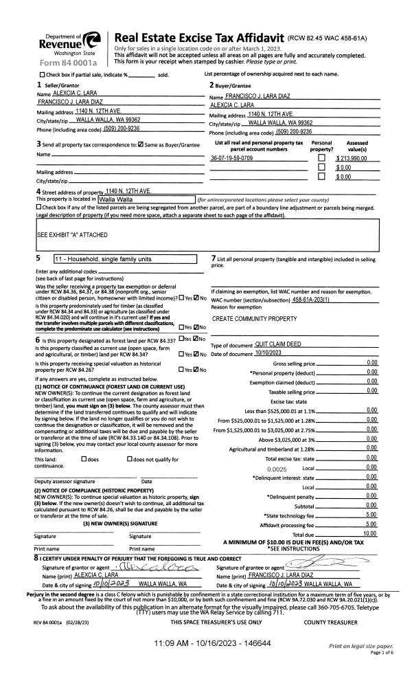 | Mailing Address: | FRANCISCO J LARA DIAZ 1140 N 12TH AVE WALLA WALLA, WA 99362 | % Ownership: | 100.0000000000% |