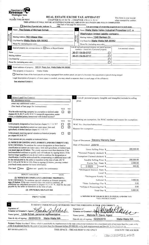 | 1 | 02/20/2019 | SWD | STATUTORY WARRANTY DEED | SCHAB MICHAEL B ESTATE OF | WALLA WALLA VALLEY INDUSTRIAL PROPERTIES LLC | | 2-PARCLES | $200,000.00 | 136413 | 2019-01119 |
