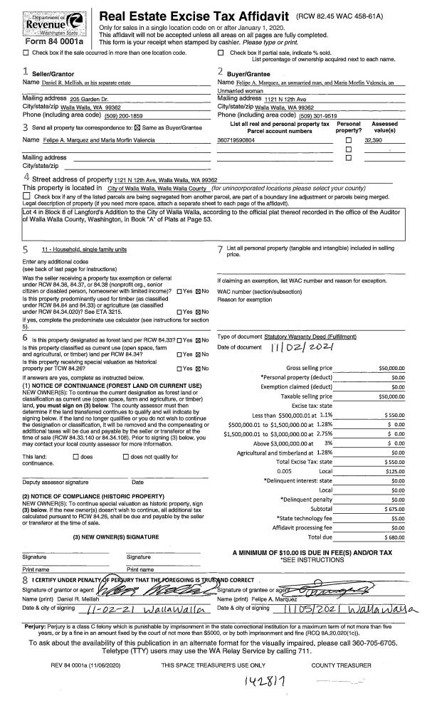 | 1 | 11/05/2021 | REAL ESTAT | REAL ESTATE CONTRACT | MELLISH DANIEL R | MARQUEZ FELIPE | | | $50,000.00 | 142817 | 2021-13312 |