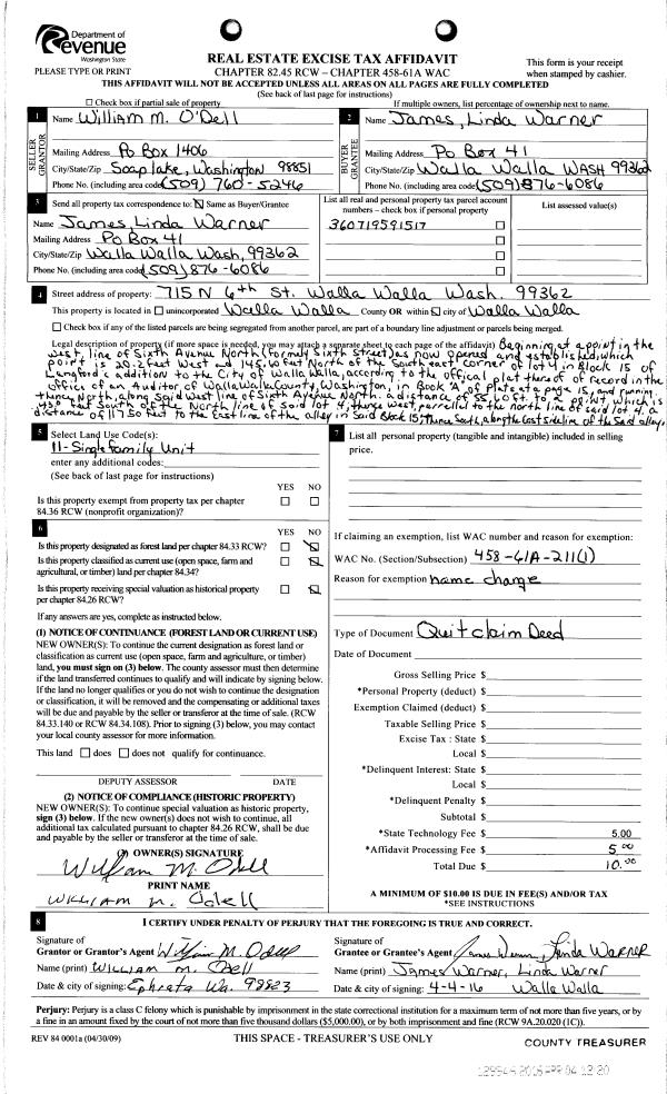 | 2 | 04/04/2016 | QCD | QUIT CLAIM DEED | O'DELL WILLIAM M | JAMES LINDA WARNER | | | $0.00 | 129946 | 2016-02445 |