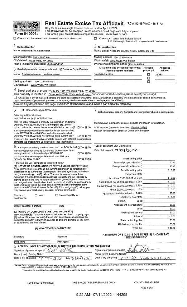 | 1 | 07/14/2022 | QCD | QUIT CLAIM DEED | NELSON BRAD | NELSON BRADLEY & LEEANNA | | | $0.00 | 144295 | 2022-05970 |