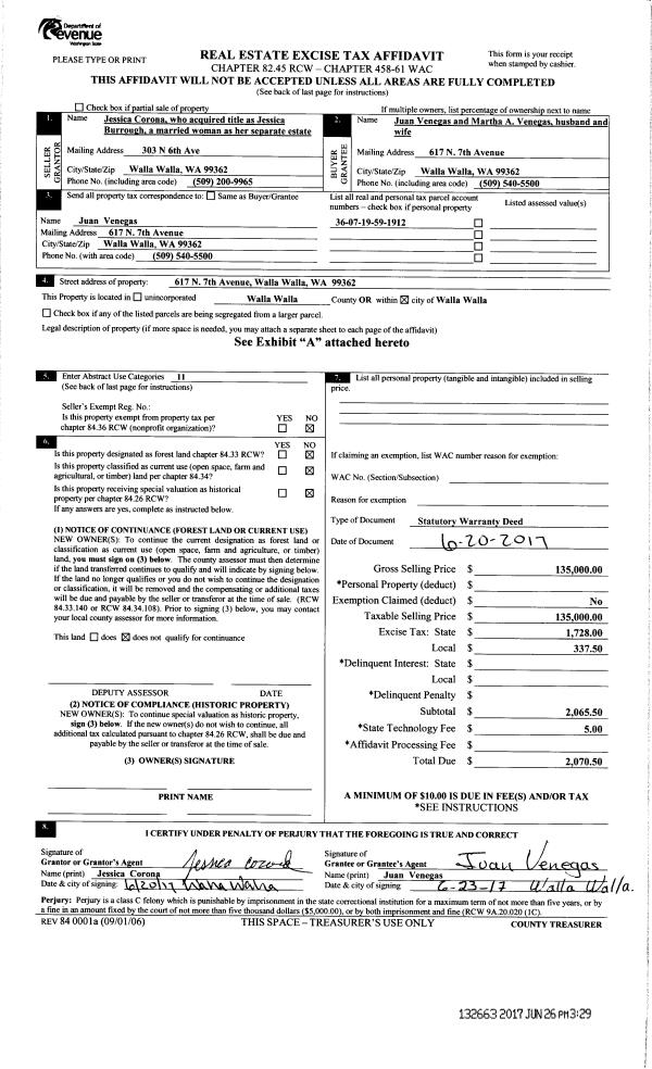 | 3 | 06/26/2017 | SWD | STATUTORY WARRANTY DEED | BURROUGH JESSICA | VENEGAS JUAN & MARTHA A | | | $135,000.00 | 132663 | 2017-04864 |