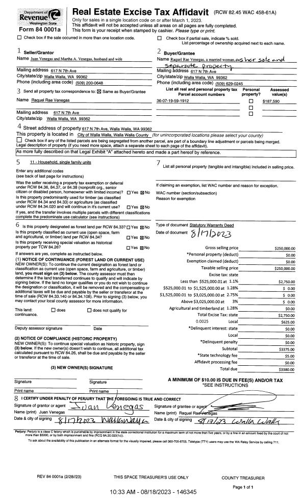 | 2 | 08/18/2023 | SWD | STATUTORY WARRANTY DEED | VENEGAS JUAN & MARTHA A | VENEGAS RAQUEL RAE | | | $250,000.00 | 146345 | 2023-04788 |