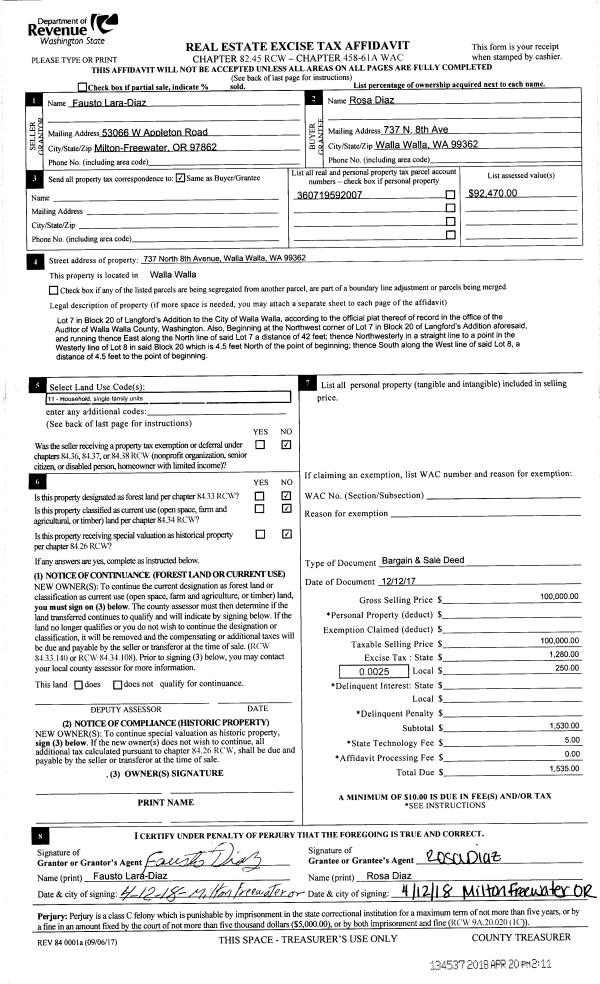 | 1 | 04/20/2018 | BARGAIN & | BARGAIN & SALE DEED | LARA-DIAZ FAUSTO | DIAZ ROSA | | | $100,000.00 | 134537 | 2018-03102 |
