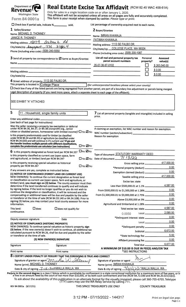 | 1 | 07/15/2022 | SWD | STATUTORY WARRANTY DEED | THONNEY MICHAEL D & JANICE R | KHAWAJA IMRAN & FATIMAH | | | $417,000.00 | 144317 | 2022-06037 |