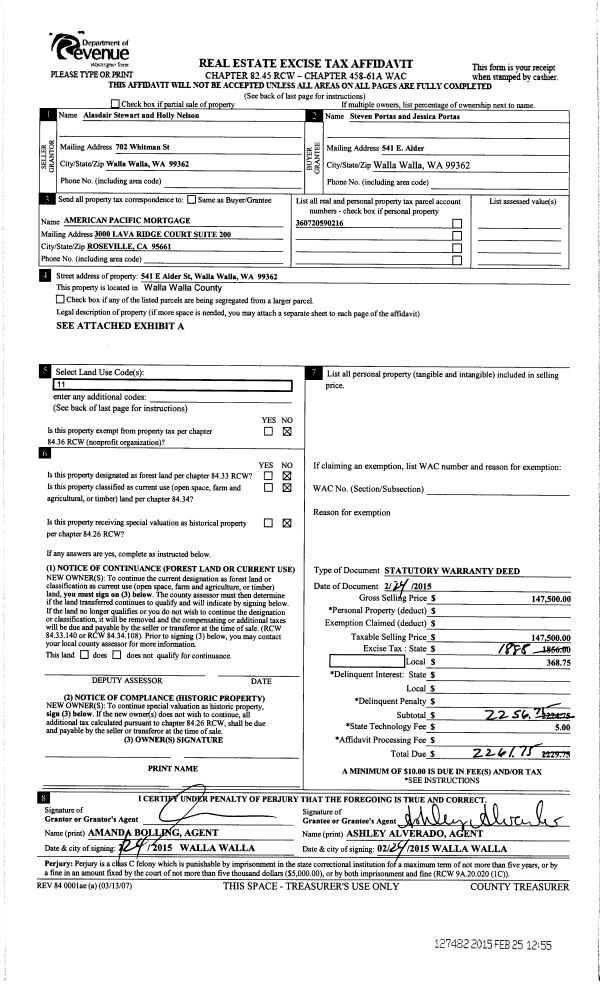 | 2 | 02/25/2015 | SWD | STATUTORY WARRANTY DEED | STEWART ALASDAIR | PORTAS STEVEN & JESSICA | | | $147,500.00 | 127482 | 2015-01663 |