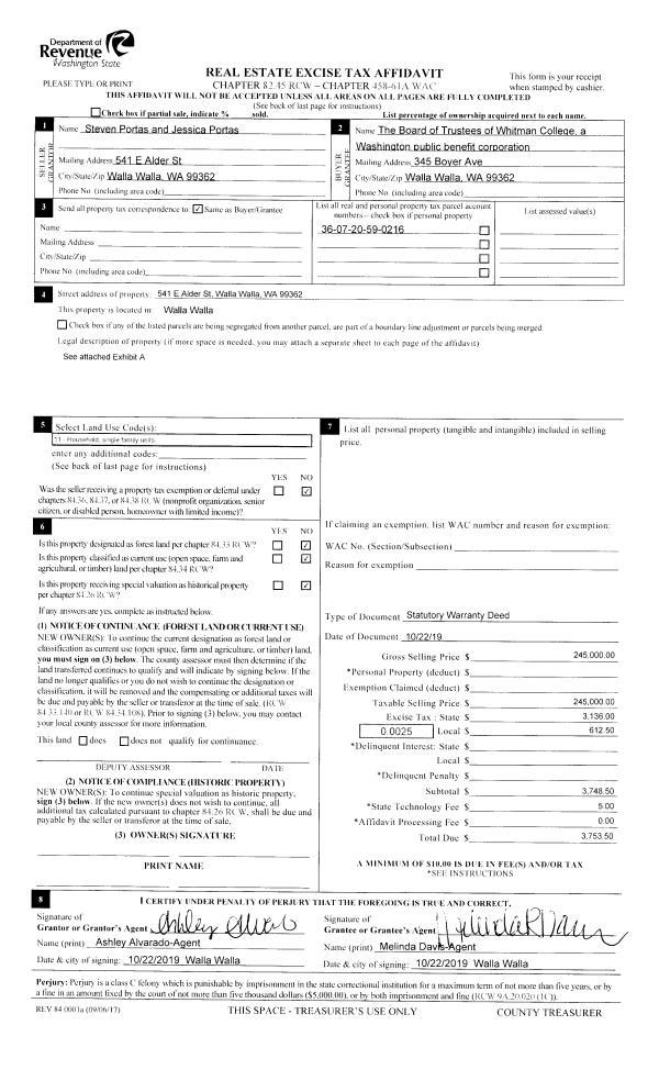 | 1 | 10/23/2019 | SWD | STATUTORY WARRANTY DEED | PORTAS STEVEN & JESSICA | WHITMAN COLL BOARD OF TRUSTEES | | | $245,000.00 | 137929 | 2019-08537 |