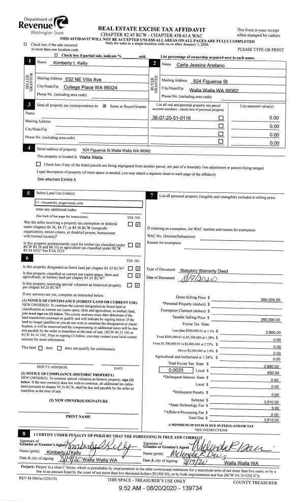 | 2 | 08/20/2020 | SWD | STATUTORY WARRANTY DEED | KELLY KIMBERLY I | ARELLANO CARLA JESSICA | | | $260,000.00 | 139734 | 2020-08278 |