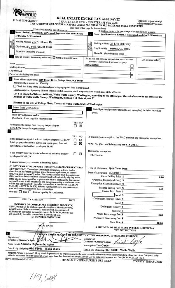 | 5 | 01/18/2011 | QCD | QUIT CLAIM DEED | WISSENBACK, DOROTHY A ESTATE O | BRUMBACH, JANICE L | | | | 119608 | 2011-00462 |