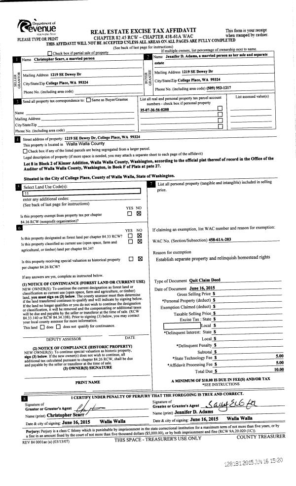 | 2 | 06/16/2015 | QCD | QUIT CLAIM DEED | SCARR CHRISTOPHER A | ADAMS JENNIFER D | | | | 128181 | 2015-05058 |