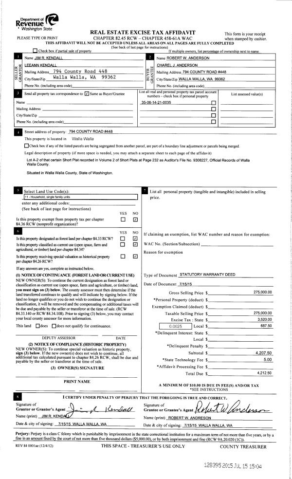 | 2 | 07/15/2015 | SWD | STATUTORY WARRANTY DEED | KENDALL JIM R & LEEANN | ANDERSON ROBERT W & CHAREL J | | | $275,000.00 | 128395 | 2015-06059 |