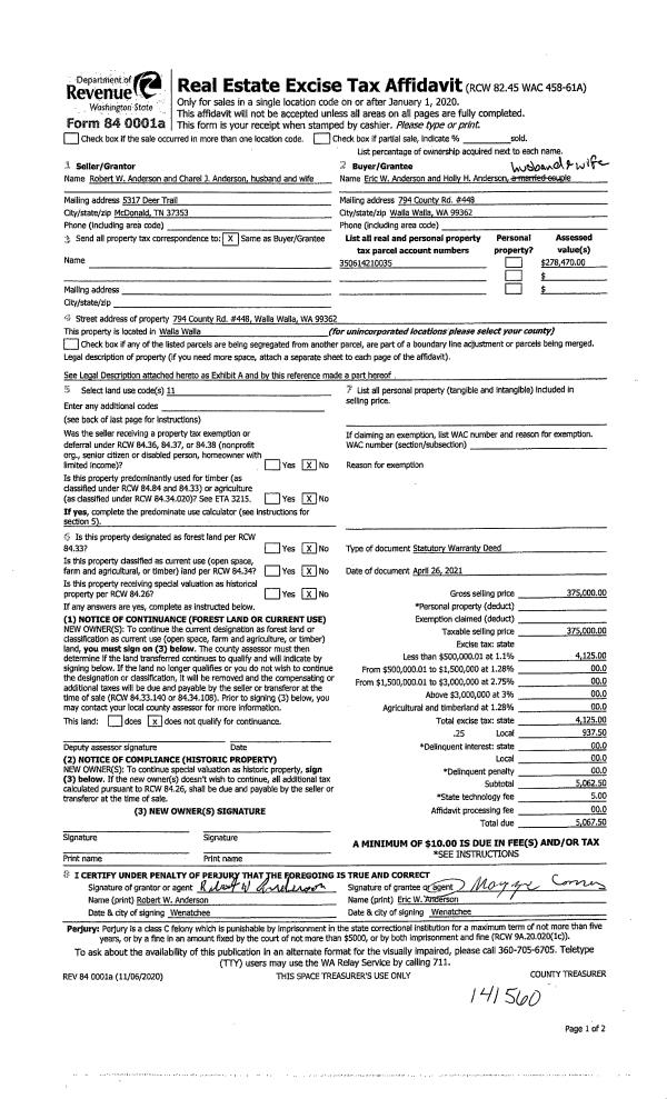 | 1 | 05/14/2021 | SWD | STATUTORY WARRANTY DEED | ANDERSON ROBERT W & CHAREL J | ANDERSON ERIC W & HOLLY H | | | $375,000.00 | 141560 | 2021-05833 |