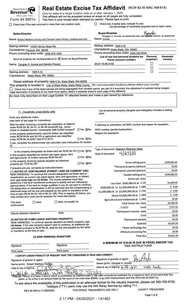 | 1 | 04/30/2021 | SWD | STATUTORY WARRANTY DEED | OWSLEY ROBERT MATTHEW & CHRISTINE IRENE | ACOSTA DOUGLAS A | | | $299,000.00 | 141462 | 2021-05126 |