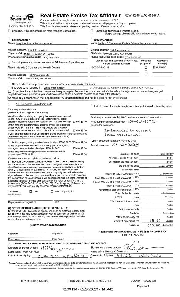 | 1 | 02/28/2023 | SWD | STATUTORY WARRANTY DEED | COLEMAN MELINDA C & KEVIN N | COLEMAN MELINDA C & KEVIN N | | | | 145442 | 2023-00994 |